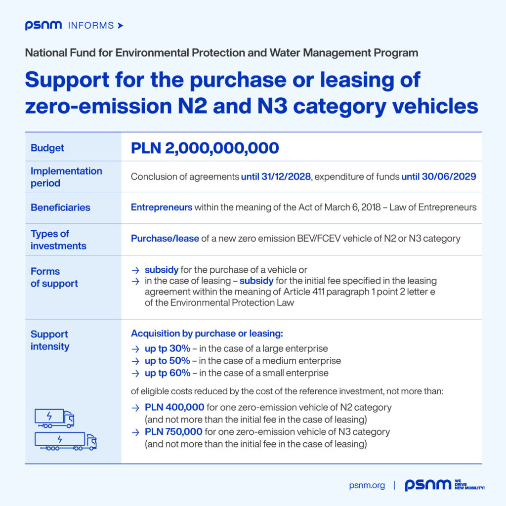 „The principles of the program approved by the EIB remain unchanged. The subsidy amount still depends on the size of the company and the type of vehicle being supported. In the case of purchases, subsidies can amount to a maximum of 30% of eligible costs for large enterprises, 50% for medium-sized enterprises, and 60% for small enterprises.” However, the total amount of support cannot exceed PLN 400,000 for category N2 vehicles or PLN 750,000 for category N3 vehicles. If leasing is chosen, the subsidy cannot be higher than the initial leasing fee,” explains Piotr Ziółkowski, Coordinator of the PSNM Committee for Logistics and Transport.